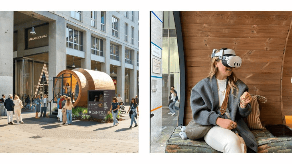 Inside the micro-architecture, visitors entered an essential and contemplative space oriented toward Milan’s Duomo, creating a continuous dialogue between urban perception and a technologically mediated gaze.