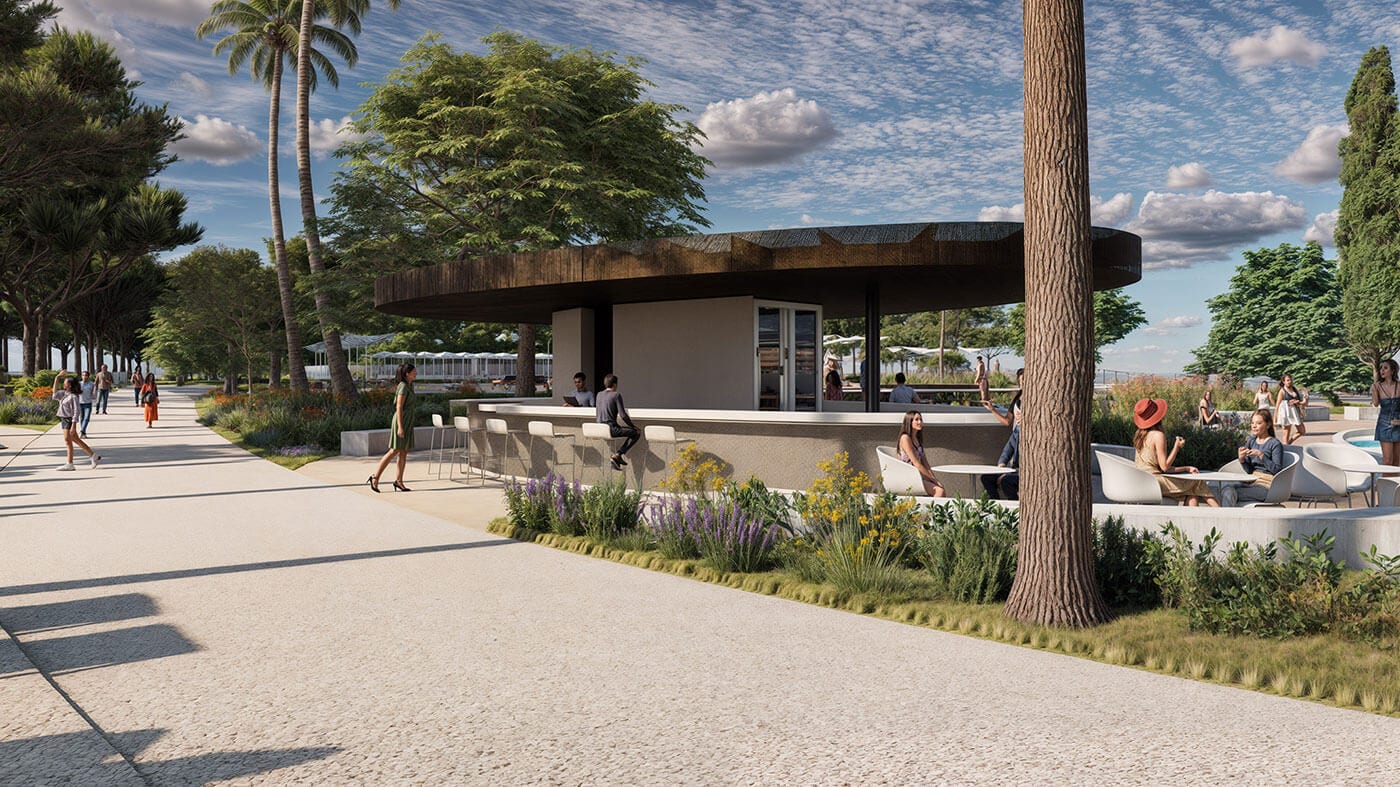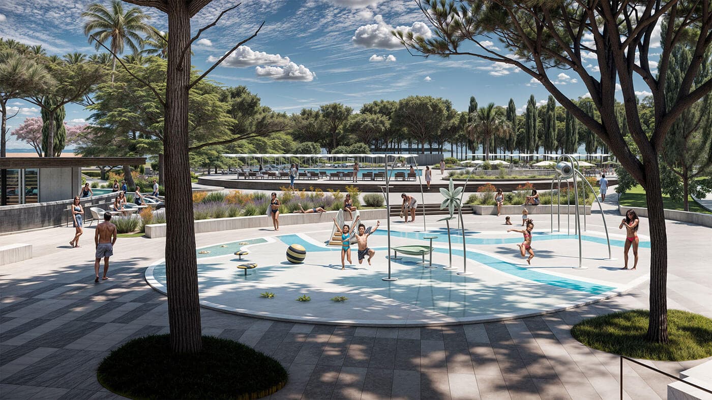 Il food con il ristorante e il supermercato, gli eventi con due anfiteatri, le piscine, la zona sport con campi da tennis e padel, l’area ricreativa e kids – saranno distinte e ognuna sarà dotata di un luogo pubblico aggregativo, ma resteranno strettamente interconnesse. È prevista una riqualificazione e diversificazione sull’area delle piscine, con vasche che offrono esperienze differenti: la principale avrà un profilo più morbido e una zona relax sommersa da utilizzare anche per attività sportiva, altre saranno caratterizzate da un fondo digradante per ricreare l’effetto di spiaggia naturale, allestite con postazioni idromassaggio riscaldate e orientate per godere del tramonto.