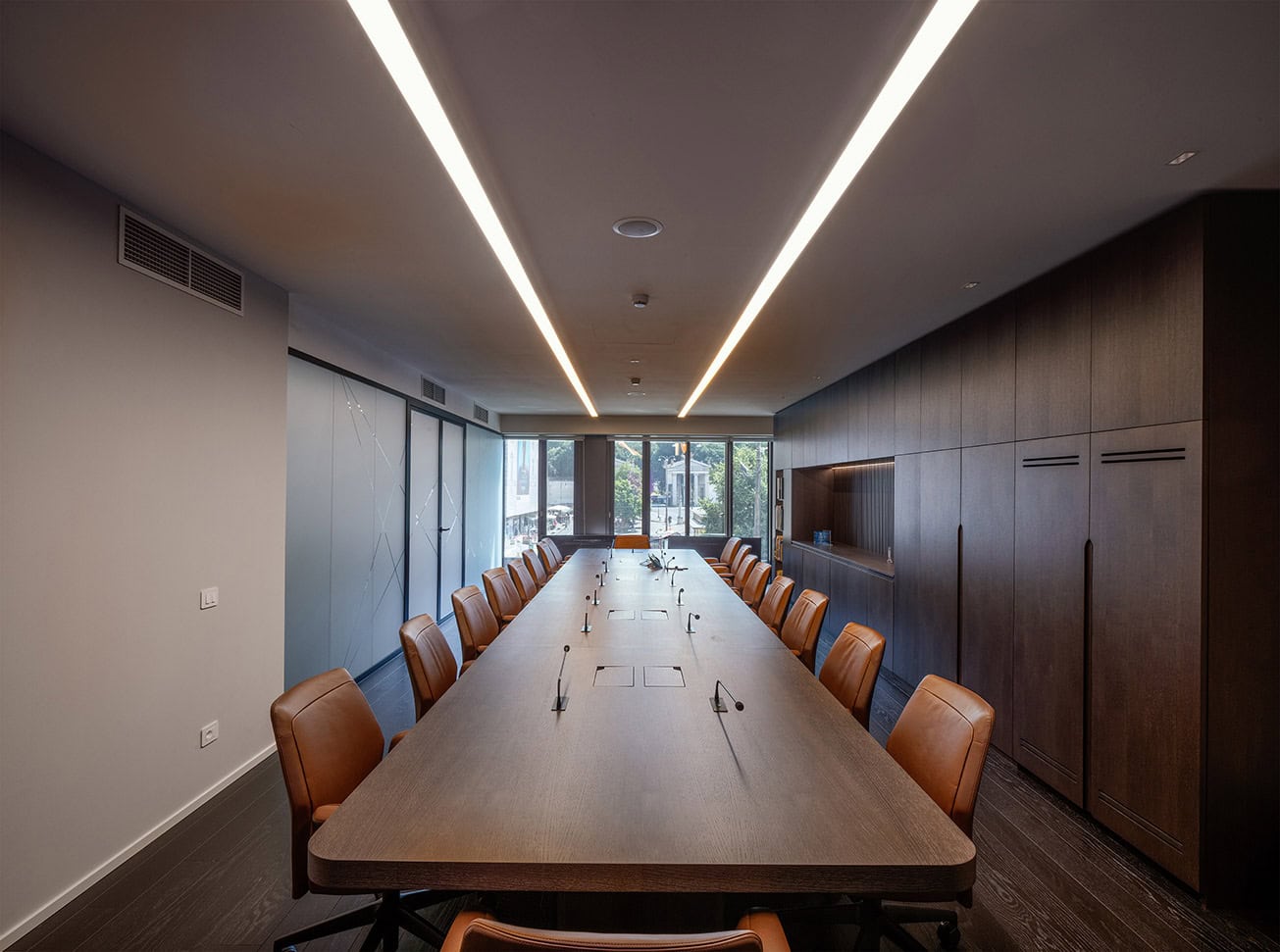Completano il progetto gli spazi direzionali, tra cui una board room attrezzata per ospitare incontri di alto profilo. Qui, materiali inediti per l’ambiente ufficio – selezionati con cura per la loro eleganza e matericità – costruiscono un’atmosfera di sobria autorevolezza, in equilibrio tra tradizione e innovazione.