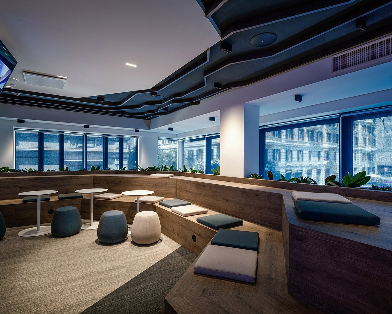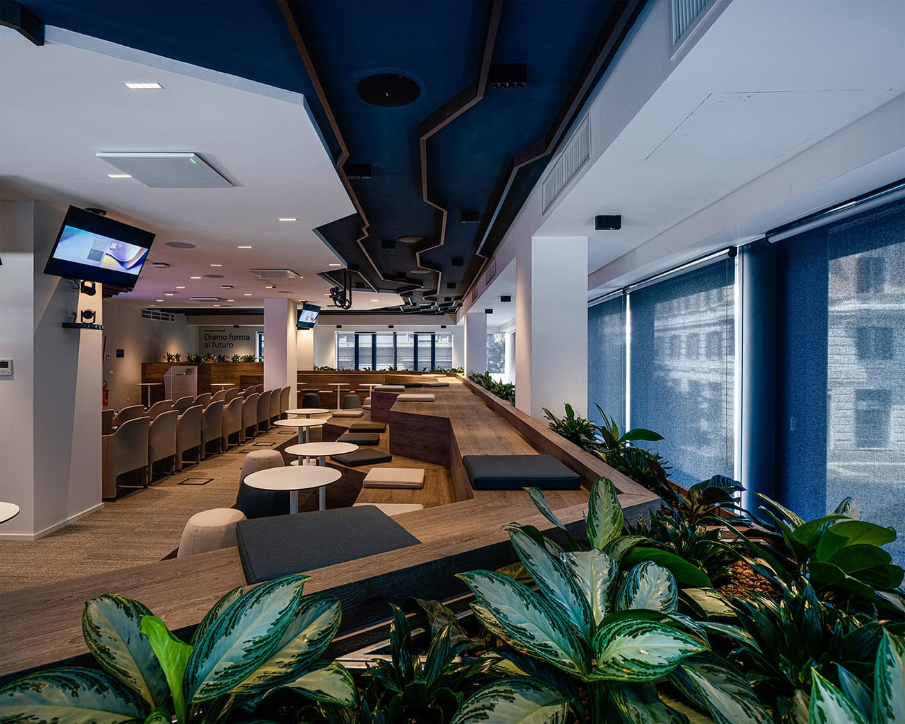 Al primo piano si apre una innovation area centrale: uno spazio flessibile e riconfigurabile, concepito come un’arena per eventi, incontri, presentazioni, momenti di condivisione e networking. Qui, la tecnologia – discreta ma pervasiva – diventa strumento per raccontare la missione innovativa del Gruppo. L’area non è solo un luogo di rappresentanza, ma un dispositivo per attivare relazioni, scambiare idee, costruire valore condiviso tra le diverse anime dell’organizzazione.