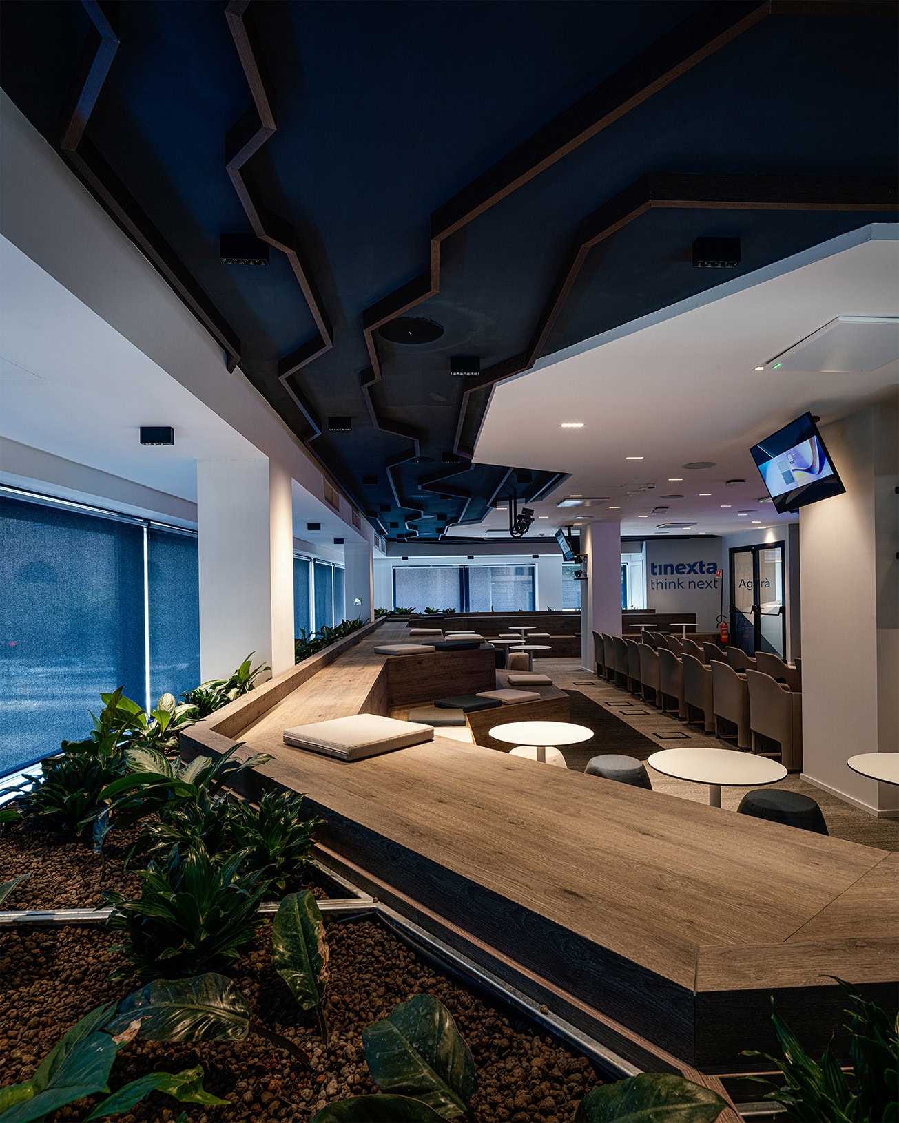 Il linguaggio architettonico mantiene una continuità con il progetto milanese, sia nei codici estetici che nei principi compositivi. Dominano i toni neutri – bianco, grigio, nero – arricchiti dal blu istituzionale del brand. Le forme spezzate e dinamiche evocano la figura della saetta, diventata cifra stilistica del sistema Tinexta: simbolo di energia, cambiamento, orientamento al futuro.